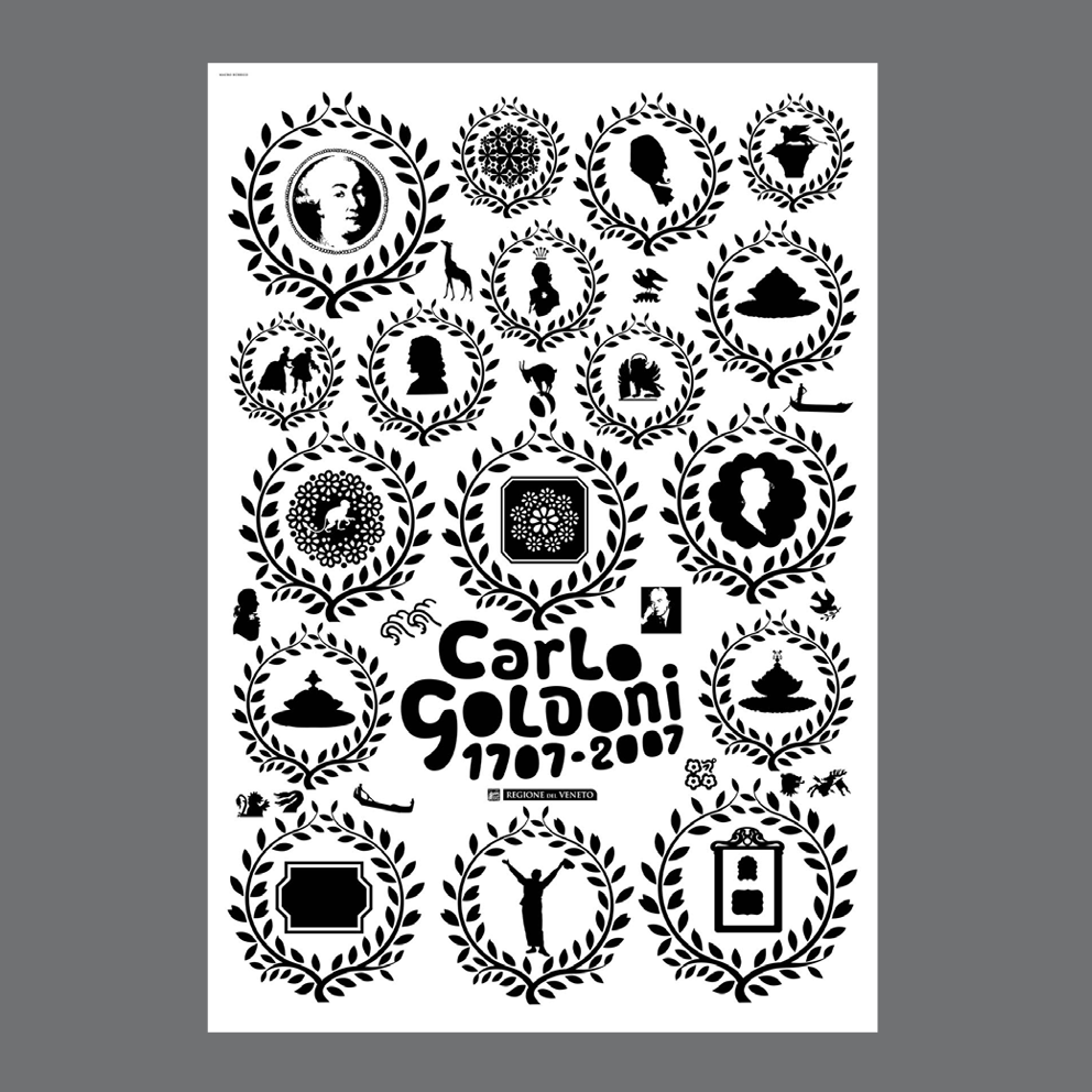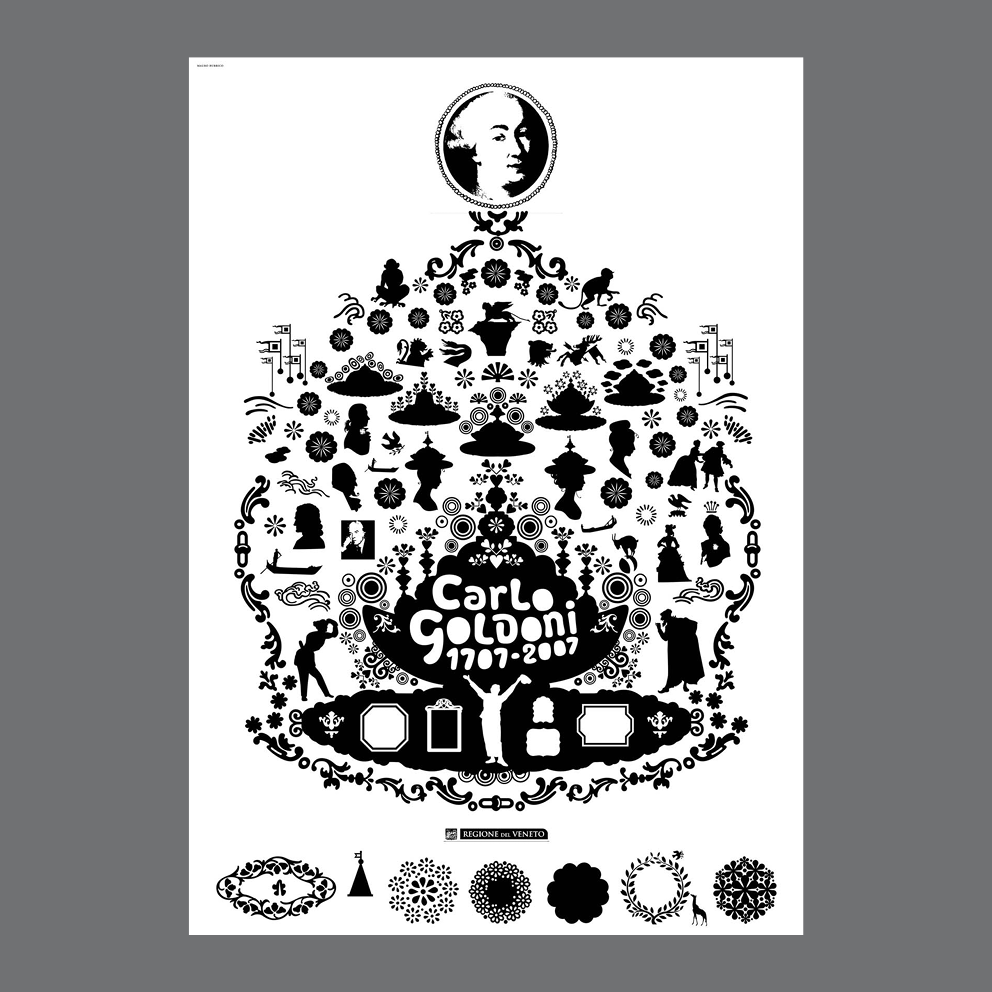 Cucina Bodoni è un carattere digitale di fregi e decori bodoniani miscelati a: icone di torte (per un buon compleanno che si rispetti), fiocchi (l'annuncio di una nascita), figure d'ombra (il teatro), glifi e piccole illustrazioni ispirate alle Mémoires di Carlo Goldoni. Ingredienti che, "cotti" in rapporti dimensionali diversi, sono stati la base per costruire i due poster: ricreare il cosmo meraviglioso di Goldoni, il mondo che ruota intorno a lui con le sue gioie e le sue asprezze, i suoi interpreti, i costumi e le scenografie attraverso le quali ha scelto di raccontare il mondo.